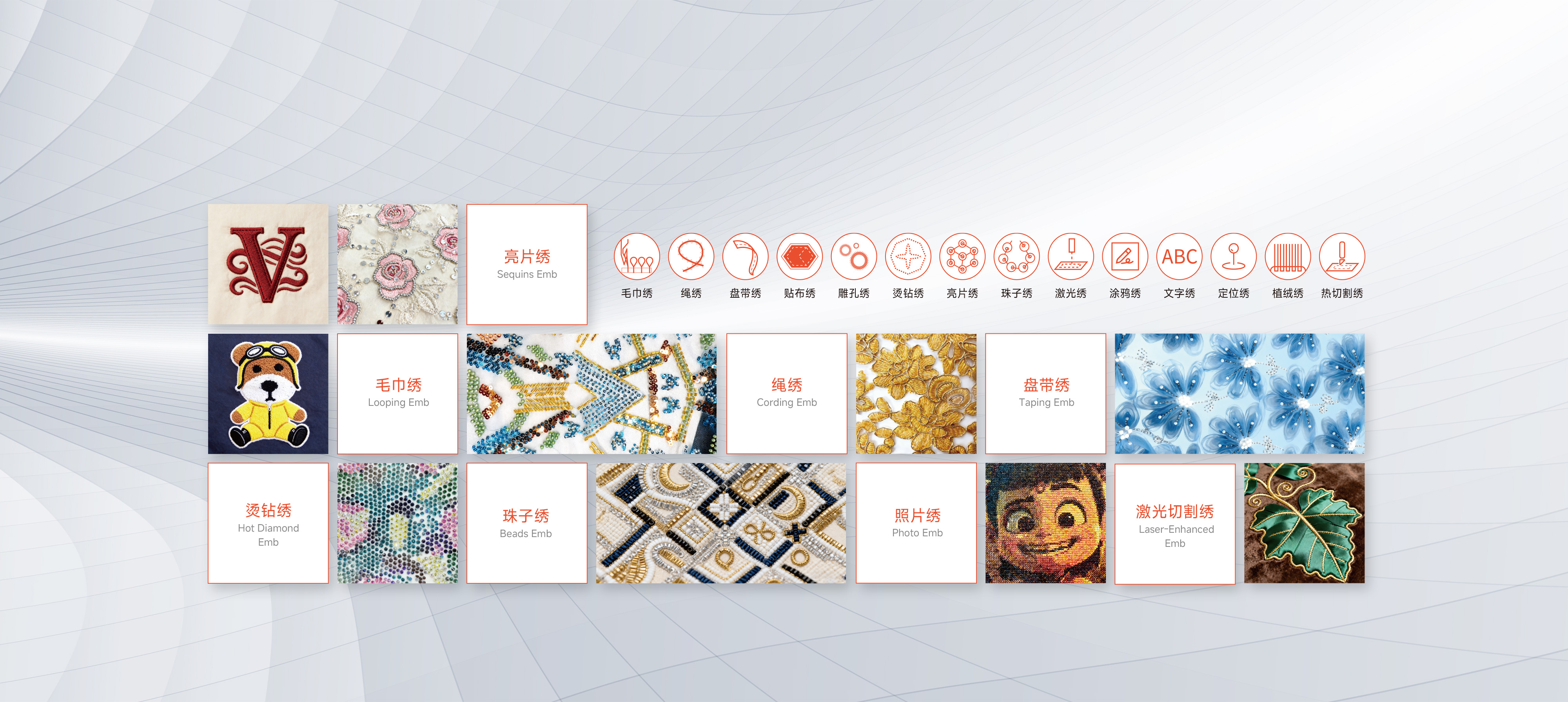 支持毛巾、平绣双主轴、双XY轴、双H轴,支持多种换色、剪线驱动方式